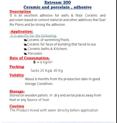 إنه لاصق ممتاز لسيراميك الحوائط والأرضيات، يعتمد على مواد أسمنتية وإضافات أخرى .
